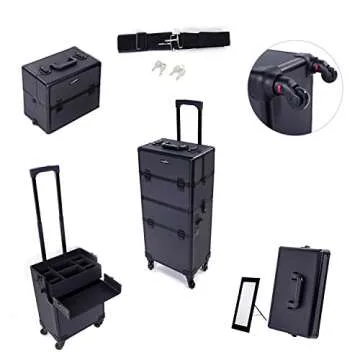 mefeir 2 in 1 Rolling Makeup Train Case, Travel Makeup Organizer Cosmetic Display Case, Aluminum Cosmetology Supply Suitcase on Wheels, Beauty Storage Luggage Lockable w/4 Removable Wheels (Black)