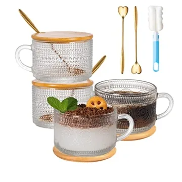 Show more The MegarTE Vintage Glass Coffee Mugs embody a union of beauty and practicality, designed specifically for those who appreciate timeless elegance in their beverage choices. Each mug holds a generous 14 oz and showcases an intricately embossed floral or dotted design, adding a luxurious touch to your everyday routine. These mugs are not just visually stunning; they also come with convenient bamboo lids and golden spoons, making them the perfect combination of style and utility. Enjoy your hot beverages in a manner that reflects sophistication and charm, whether inside your home or while basking in the gentle sunlight during an outdoor gathering.