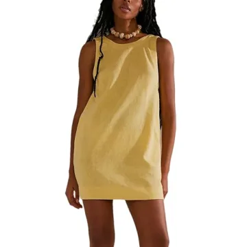 Megfie Womens Summer Crew Neck Sleeveless Open Back Dress Casual Beach Sunshine Cotton Linen Mini Dress(0793-Yellow*1-M)