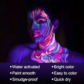 Show moreIntroducing the MEICOLY Neon Face Paint, your ultimate creative companion for vibrant and eye-catching body art! This UV Blacklight Glow Face Paint set features 8 bold colors designed to ignite your artistic flair whether it’s for a night out, festival, or a fun glow party. With colors that pop in daylight and truly come alive under UV light, this paint assures you are not just seen, but also *admired*. Made with a water-based formula, the paint glides on smoothly for a flawless finish that’s rich yet easy to manage.