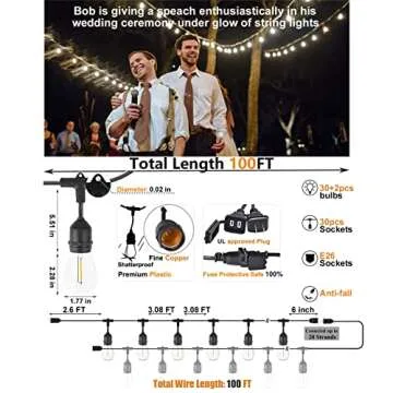 Show more Transform your outdoor space into a magical retreat with the Meidaoduo Outdoor String Lights LED 100FT. This stunning heavy-duty patio lighting solution is perfect for adding a touch of elegance and warmth to your backyard, gazebo, or pergola. With 32 dimmable shatterproof plastic bulbs, these lights not only create a beautiful bistro ambiance reminiscent of Italian cafes but also withstand the test of time and weather conditions. Their long-lasting performance and stylish design make them a great choice for romantic evenings, vibrant celebrations, or cozy gatherings with family and friends.