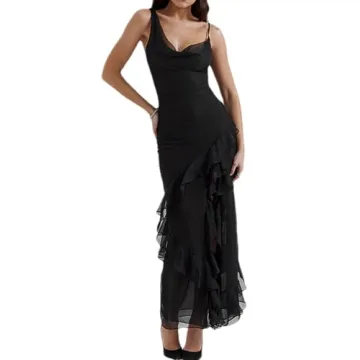 Show moreStep into elegance with the Meilun Women's Cowl Neck Ruffle Wedding Guest Dress. Crafted from luxurious mesh, this stunning black maxi dress features a timeless cowl neck and delicate ruffle hem that flows gracefully, adding a touch of femininity to any occasion. Designed to hug your curves beautifully, the sleeveless silhouette is perfect for showcasing your figure, while the chic side slit allows for easy movement, making it an ideal choice for cocktail parties, wedding receptions, or formal events.