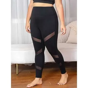 MEJING Plus Size Workout Leggings for Women with Pockets Black Yoga Pants Tummy Control Mesh High Waist Gym Clothes Athletic Stretchy Black 4XL