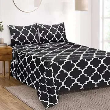 Mejoroom Queen Bed Sheet Set - Super Soft Brushed Microfiber 1800 Thread Count Queen Sheets with 16 inch Deep Pocket - Wrinkle Free - 4 Piece(Queen, Black Quatrefoil with White Pattern)