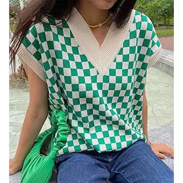Meladyan Women Checkered Plaid Pattern Knit Sweater Vest Loose V Neck Knitwear Sleeveless Preppy Tank Top Pullover Green