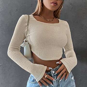 Meladyan Women Long Sleeve Knitted Solid Crop Top Square Neck Fitted Asymmetrical Hem Cropped Tee Shirts Apricot