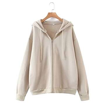 Meladyan Women's Oversized Solid Zip Up Drawstring Long Sleeve Fleece Vintage Pockets 90s Coat Hooded SweatShirt, Apricot, Medium