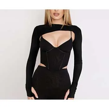 Meladyan Women's Sexy Long Sleeve Mesh Crop Top Solid Cover Up Spaghetti Strap Slim Fit Corset Cami 2 pieces Clubwear, Black, Medium