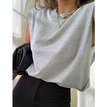 Meladyan Women’s Solid Cotton Padded Shoulder Sleeveless Tee Vest Crew Neck Loose Tank Tops Grey
