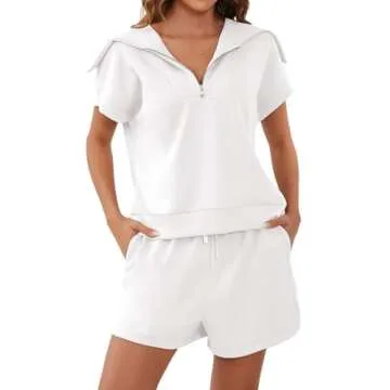 Meladyan Women's Two Piece Half Zip Lapel Sleeve Sweatshirt High Waist Drawstring Sets SweatSuit Cap Shorts TrackSuit Outfit, White, Small
