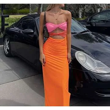 Show more Discover the perfect blend of elegance and allure with the Meladyan Women Sexy Cutout Patchwork Bodycon Midi Dress. This stunning orange dress is designed to turn heads at any night out or club event. Featuring a captivating cutout design, this dress showcases your curves in all the right places while maintaining a sophisticated allure. Crafted with meticulous attention to detail, the bodycon fit hugs your silhouette perfectly, offering both comfort and style. The strapless style and backless cut elevate the overall chic aesthetic, making this a must-have piece for your wardrobe.