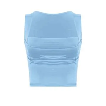 Meladyan Women Sexy Pleated Ruched Crop Tank Top Blue Square Neck Strappy Sleeve Cropped Vest Cami Shirt Clubwear