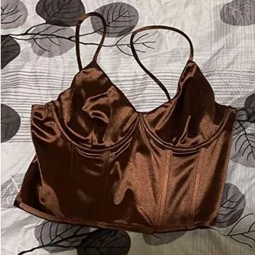 Meladyan Women Sexy Spaghetti Strap Satin Crop Corset V Neck Sleeveless Crop Bustier Slim Fit Clubwear Crop Camis Top (US, Alpha, Small, Regular, Regular, Brown -1)