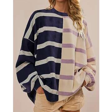 Meladyan Women Striped Oversized Pullover Sweater Crew Neck Color Block Long Sleeve Loose Soft Knit Casual Fall Tunic Tops