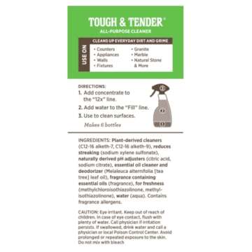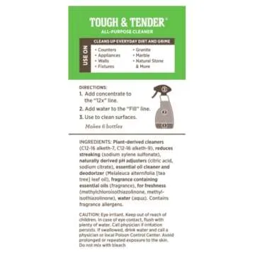 Show more The Melaleuca Tough & Tender 12x All-Purpose Cleaner is the ultimate cleaning solution for every home! This 8 fl. oz. bottle is designed with super-concentration in mind, meaning just a small amount can tackle dirt, grease, and the everyday messes that accumulate in any living space. Its powerful formula ensures longevity, meaning each bottle goes a long way, providing great value in your cleaning supplies. With its plant-based and biodegradable characteristics, this cleaner embodies a conscientious approach to household cleaning.