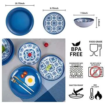12-Piece Melamine Dinnerware Set for 4 - Dishwasher Safe, Blue Floral Design