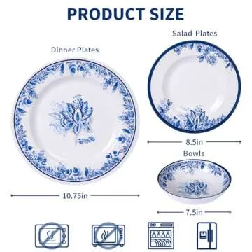 Show moreIntroducing the exquisite Melamine Dinnerware Sets, a stunning 12-piece floral dinnerware collection designed to elevate your dining experience. This versatile set includes 4 dinner plates (10-3/4 inch), 4 dessert plates (8-1/2 inch), and 4 cereal bowls (7-1/2 inch), ensuring you are well-equipped for family meals and entertaining friends. Each piece showcases a charming blue and white porcelain floral pattern that seamlessly blends convenience and beauty, making it a delightful addition to any occasion, whether it's a casual lunch or an elegant dinner party.