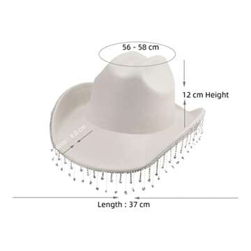 Show moreThe Melesh Adult Women Men Cowgirl Felt Wide Brim Costume Western Cowboy Hat in a stunning Diamond-Ivory hue is the ultimate accessory for any cowgirl or cowboy enthusiast. Crafted from high-quality faux suede polyester, this hat not only retains its classic shape but also offers unmatched style and comfort. Designed with a head circumference of approximately 23.2 inches (59 cm), it fits head sizes from 56-59 cm (22-23.8 inches), ensuring a snug and secure fit for most adults. The wide brim measuring 9 cm not only enhances its stylish appeal but also provides essential sun protection, making it your perfect partner for outdoor adventures.