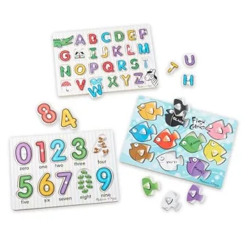 Show more Introduce young learners to the joyous world of mathematics and language with the Melissa & Doug Classic Wooden Peg Puzzles 3-Pack. Designed especially for toddlers aged 3 and above, this exceptional collection combines vibrant colors and engaging shapes to ensure a delightfully immersive learning experience. Each puzzle features premium-quality wooden construction that withstands the test of time and enthusiastic hands, ensuring safety and durability during countless play sessions.