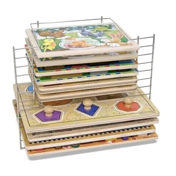 Show more Introducing the Melissa & Doug Deluxe Wire Puzzle Storage Rack, a well-crafted solution for keeping your child's puzzles organized and accessible! This sturdy metal structure is designed to hold up to 12 puzzles of varying sizes, making it an essential addition to any playroom. With its three-quarter-inch slots, it accommodates everything from chunky wooden jigsaws to peg puzzles and jumbo knob puzzles, ensuring your children's favorite activities are neatly stored away yet easy to reach.