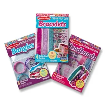 Show more Ignite your child's imagination with the delightful Melissa & Doug Design-Your-Own Jewelry-Making Kits! This set offers three unique kits in one, allowing budding designers to create bangles, headbands, and bracelets tailored to their individual style. Each kit contains 4 bangle-style durable plastic bracelets, 4 soft reversible bracelets, and 2 reversible headbands, each ready to be beautified with an array of sparkling decorations that are included. With an exciting assortment of peel-and-stick sparkle gems, glitter stickers, and jewel decorations, young artists can let their creativity shine bright!