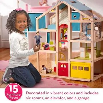 Melissa & Doug Hi-Rise Wooden Dollhouse With 15 pcs Furniture - Garage and Working Elevator
