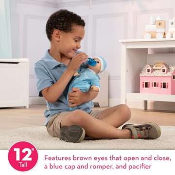 Show moreIntroducing the Melissa & Doug Mine to Love Jordan doll, the perfect companion for your little ones to cuddle and care for! At 12 inches long, this adorable baby boy doll is specially designed for toddlers 18 months and older, making it the ideal size for tiny hands to grasp and hug. The Jordan doll comes with a light skin tone, bright brown eyes, and a charming expression that captures the innocence of childhood. One of his standout features is his ability to suck his thumb or pacifier, enhancing the imaginative play experience.