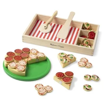 Show moreUnleash your child's imagination with the Melissa & Doug Wooden Pizza Party Play Food Set, designed for mini chefs aged 3 to 6. This delightful set features six sliceable wooden pizza slices, crafted for endless pretend play. Each pizza slice is adorned with vibrant, wooden toppings—36 in total!—that can be arranged and re-arranged for endless customization and creativity. With easy-to-use self-stick tabs, your young ones can seamlessly hold their toppings in place, only to be effortlessly 'sliced' apart, enhancing both their motor skills and imaginative play experiences.