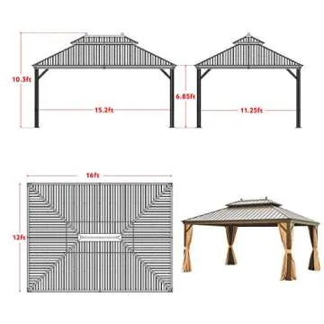 The spacious 12 x 16 FT design provides ample room for various outdoor furniture arrangements, perfect for dining sets or lounge chairs.