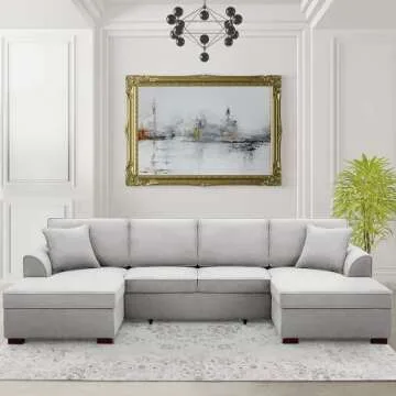 MELLCOM Reversible Sectional Sofa with Pull-Out Bed, Upholstered U-Shape Sofa with Storage, Sectional Sofa with Chaise Lounge, Convertible Sectional Sofa Couch with Storage, Light Gray