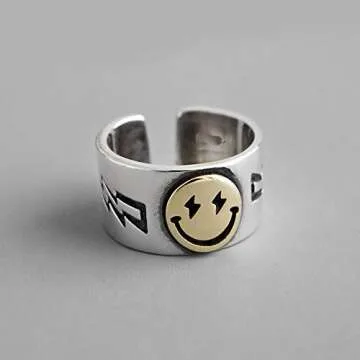 MELLIFO Preppy Smile Face Ring Wide Chunky Adjustable Vintage Silver Smiling Stackable Open Finger Ring for Women Men (Style 1)
