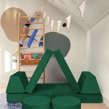 **Unleash your child's creativity** with a versatile design that consists of four foldable seats, two supporting back cushions, and two wonderfully soft round cushions. Children can transform these pieces into anything from a cozy fort to a rocket ship or even two chairs for climbing and playing. This sofa encourages active play and exploration, developing both imaginative skills and motor coordination.