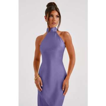 Show moreIntroducing the Memoriesea Women's Sexy Satin High Split Sleeveless Backless Party Wedding Maxi Dress in a captivating purple hue! This stunning dress combines elegance and allure seamlessly, making it an exceptional choice for any fashionable woman looking to make a statement. Crafted from a lightweight, soft, and smooth satin fabric, it promises to keep you comfortable while accentuating your natural charm. The highlight of this dress is its completely backless design paired with a sophisticated high neck and oversized tie neck detail, ensuring you catch every eye in the room. With a maxi length that elegantly flows to the floor, this dress is perfect for showcasing your figure while adding a touch of sexiness to your ensemble.