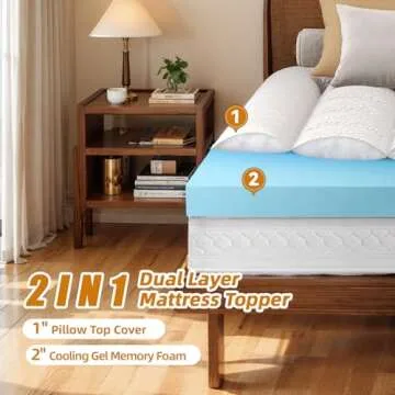 Show more Transform your sleep experience with the Minlove Memory Foam Mattress Topper, a decadent blend of comfort and support meticulously designed to ensure you wake up refreshed and rejuvenated. This 2-inch gel cooling mattress pad features a plush layer of high-quality memory foam, providing just the right amount of softness, while the complementary 1-inch quilted pillow top delivers an irresistibly cozy feel. Perfect for those looking to enhance the comfort of their existing mattress, this topper adapts to your body, ensuring optimal alignment and support throughout the night.