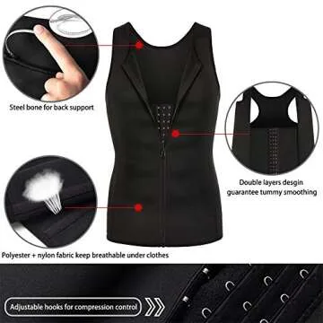 Men 2-in-1 Waist Trainer Vest, Sweat Body Shaper Tank Top, Neoprene Zipper Adjustable Strap Workout Sauna Suit (Black Body Shaper Vest with Zipper, XL)