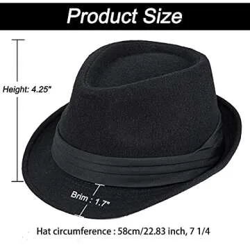 Show moreElevate your fashion game with this Men's Classic Fedora, the quintessential trilby hat that combines elegance and functionality. Crafted from high-quality polyester felt, this stylish accessory boasts not only durability but also a soft finish that feels great against your skin. With a circumference of approximately 58cm (22.83 inches) and a height of 4.25 inches, it perfectly fits most adults, ensuring a snug yet comfortable experience. Whether you're looking to make a statement or simply stay warm in colder months, this fedora effortlessly fits the bill.