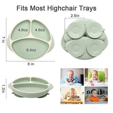 Mengdababy Suction Plate for Baby Toddler, Silicone Grip Dish with 4 Extra Large Suction Cups, Divided Design, Dishwasher and Microwave Safe with Heat Resistence Handles,BPA Free Green