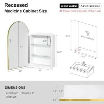 Mepplzian Recessed Medicine Cabinet with Mirror,Arched Medicine Cabinet for Bathroom,Brushed Gold Medicine Cabinet in Wall Bathroom Cabinet with Mirror,Mirrored Medicine Cabinet Wall Mounted 20x30 in