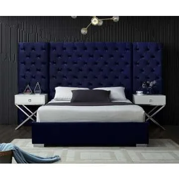 Meridian Furniture Grande Collection Modern | Contemporary Velvet Upholstered Bed with Luxurious Deep Button Tufting and Stainless Steel Legs in Polished Chrome Finish, Navy, Queen