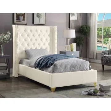 Show moreIntroducing the exquisite Meridian Furniture Soho Collection Modern Wingback Bed, where contemporary design meets unparalleled elegance. This twin-sized bed features a sophisticated bonded leather upholstery in a pristine white finish, adorned with deep button tufting and luxurious gold nailhead trim. Designed to make a statement, it effortlessly enhances any bedroom decor while providing the utmost comfort for a good night’s sleep.