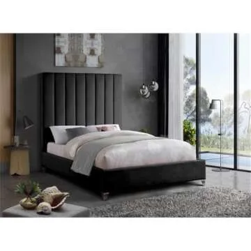Meridian Furniture ViaBlack-Q Via Collection Modern | Contemporary Velvet Upholstered Queen Bed, Rich Black Velvet, Deep Channel Tufting, Gold and Chrome Legs, 65.5" W x 86" D x 70.5" H, Black, Queen