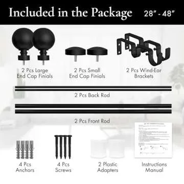 Show moreTransform your living space with the Meriville 1-Inch Diameter Ball Telescoping Double Window Treatment Curtain Rod. Perfectly designed to enhance any interior, this curtain rod set combines elegance with functionality. Crafted from sturdy metal, it includes a complete set with two metal rods, two metal ball finials, two end cap finials, double brackets, and all necessary mounting hardware, ensuring you have everything you need for a smooth installation and a refined finish. Available in multiple sizes ranging from 28" to 120", you can customize the fit for your windows with ease. This set in a sleek black finish not only looks modern but is durable enough for long-term use.