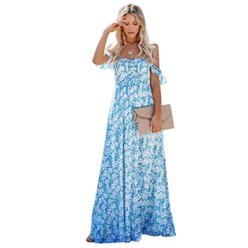 MERMAID'S CLOSET Womens Straps Blue Floral Print Smocked Maxi Dress Boho Casual Chiffon Flowy Beach Long Dresses