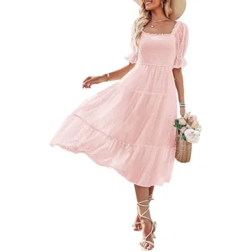 Show more Introducing the MEROKEETY Women's 2023 Pink Dress, the quintessential dress for the modern woman who embraces both style and comfort. Crafted with meticulous attention to detail, this summer square neck flounce sleeve A-line midi dress is perfect for a multitude of occasions—from casual outings to pivotal events like weddings or brunch with friends. The soft, lightweight fabric ensures that whether you're navigating a warm summer day or celebrating during the spring, you will feel as good as you look. With the Swiss dot pattern adding a touch of elegance and charm, this dress is designed to amplify your confidence and enhance your natural beauty.