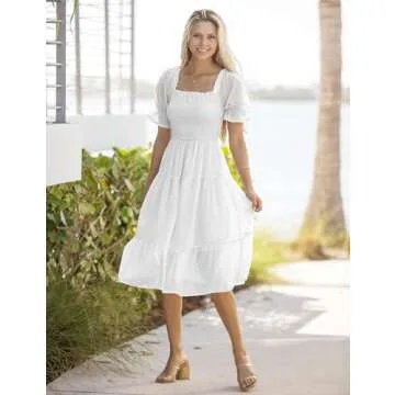 Show more Discover the MEROKEETY Women's 2023 White Dress, a captivating summer essential that combines elegance and comfort effortlessly. This Boho Midi Dress features a unique square neck design and charming puff sleeves, making it perfect for any summer outing. The light fabric is breathable and flowy, ensuring you remain chic and cool, while the intricate swiss dot pattern and feminine ruffle detailing add a playful touch. Designed to flatter a variety of body types, this versatile midi dress transitions seamlessly from casual daytime wear to elegant evening events.