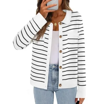 Show moreIntroducing the MEROKEETY Women's 2024 Fall Knit Striped Long Sleeve Sweater, the perfect addition to your autumn wardrobe. This stylish cardigan features a beautiful navy color that stands out, making it not only a practical choice but also a fashionable one. Crafted with a soft, skin-friendly, and breathable fabric, it offers unbeatable comfort against the skin while providing ample warmth for chilly days. The long sleeves and classic lapel collared neckline design add an elegant touch, transforming a simple sweater into a sophisticated staple. The modern striped style brings a contemporary flair to your outfit, making it easy to dress up for work or keep it casual for a day out.