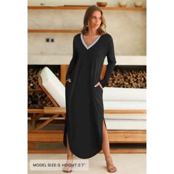 Show more If you are on the hunt for that perfect blend of comfort and style, look no further than this exquisite long sleeve maxi dress. Designed for the modern woman, this elegant piece stands out with its unique blend of functionality and fashion. Made by a trusted brand known for quality, this dress features a slightly elastic fabric that is not only soft but also skin-friendly, providing warmth and comfort regardless of the season.
