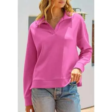 MEROKEETY Women's 2024 Fall Long Sleeve Sweatshirts V Neck Polo Casual Loose Basic Pullover Tops Shirts, HotPink, L
