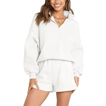 MEROKEETY Women's 2024 Fall Oversized 2 Piece Lounge Sets Long Sleeve Zipper Shorts Sweatsuit Outfits with Pockets, White, M