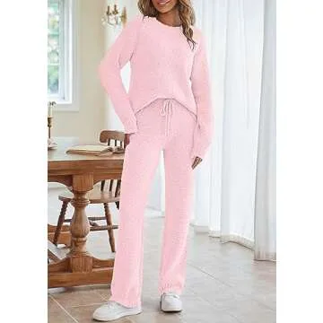 MEROKEETY Women's 2024 Fall Trendy Crew neck Top and Pants Solid Color Knit Lounge Sweater Sets, Pink, Medium